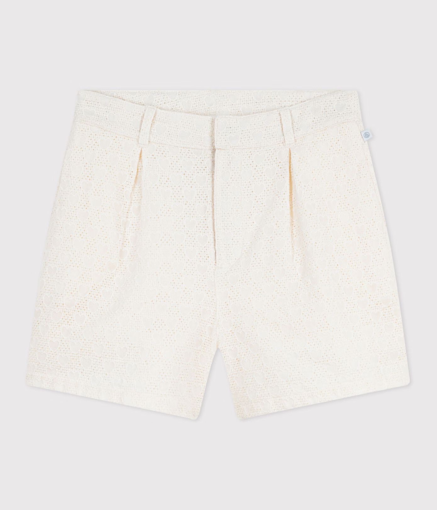 Short fille en broderie anglaise, une toile légère et fine avec un motif coeur à l’aspect brodé.